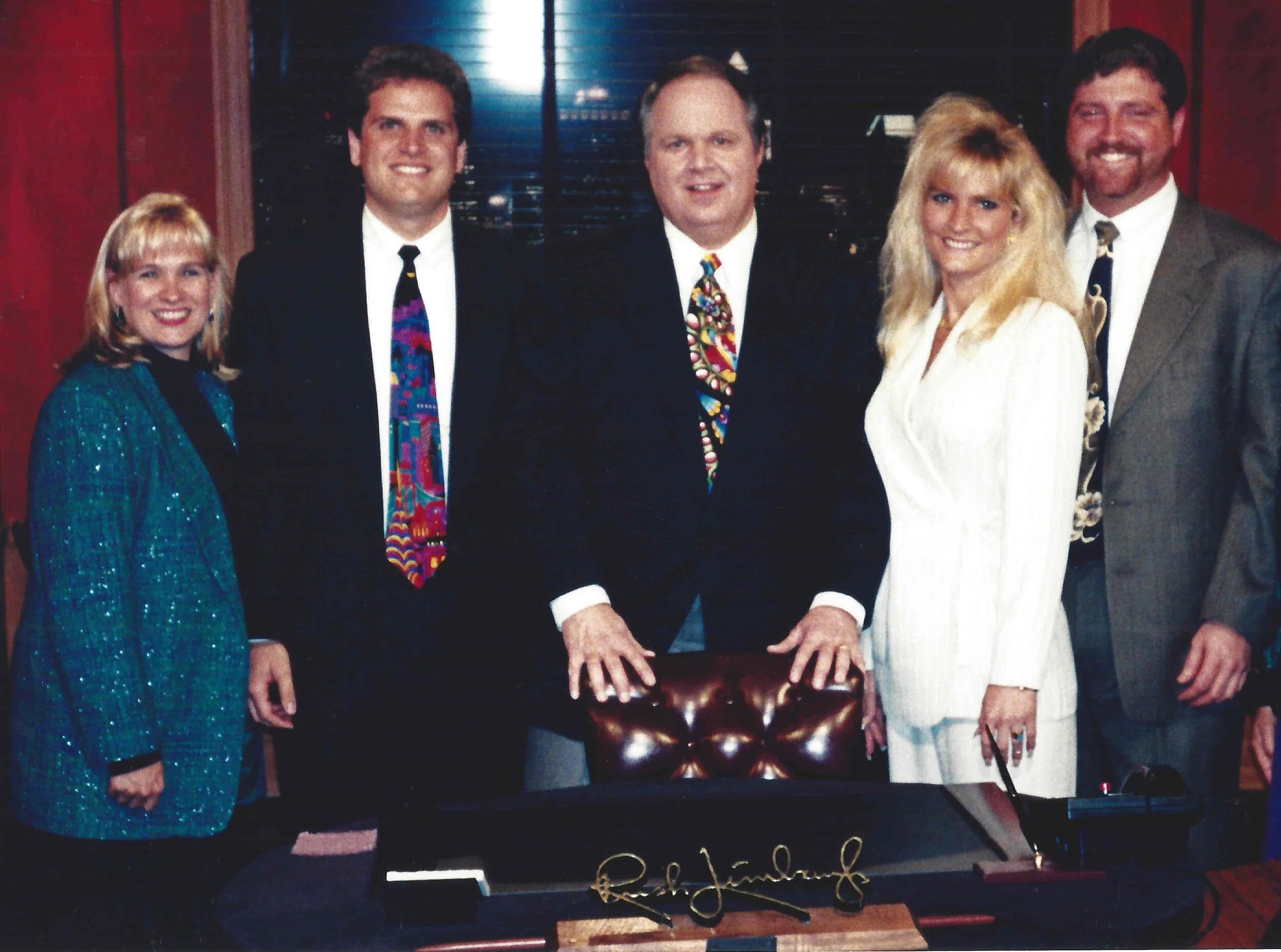 This photo was taken in 1996 in the studio of Rush's TV show immediately following an episode. I was the sales manager at WCOA at the time, and we had conducted an on-air giveaway of a trip to New York City to view a taping of Rush's television show. My wife and I accompanied the winner on the trip.